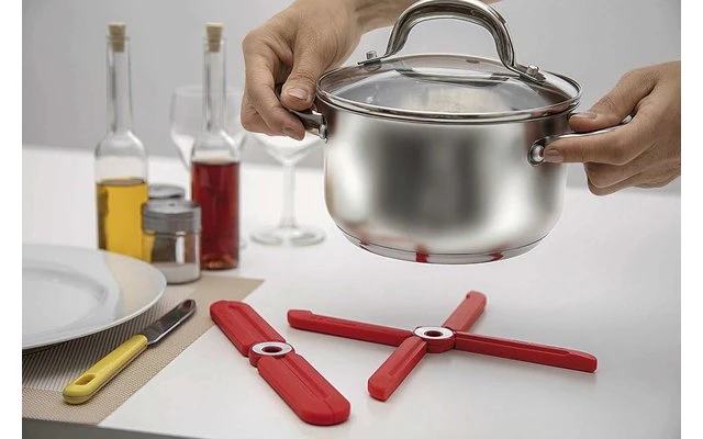 WEDO Design-Topfuntersetzer aus Silikon. Praktischer und platzsparender Topfuntersetzer in anspruchsvollem Design, inspiriert von klassischen Propellermaschinen der Luftfahrtgeschichte. Das dezente Design mit dem gebürsteten Edelstahlring passt sich zeitlos an jede Inneneinrichtung an und muss sich nicht in einer Schublade verstecken. Aufgeklappt zu einem Kreuz nimmt er Pfannen, Töpfe und Backformen bis zu einem Durchmesser von 25 cm sicher auf. Verschmutzungen können mit einem weichen Schwamm unter warmem Wasser abgewischt werden.